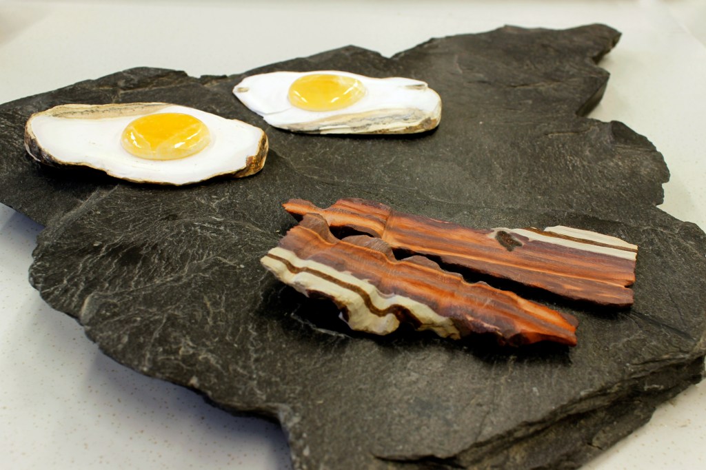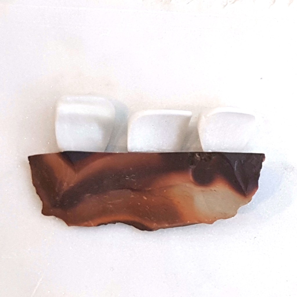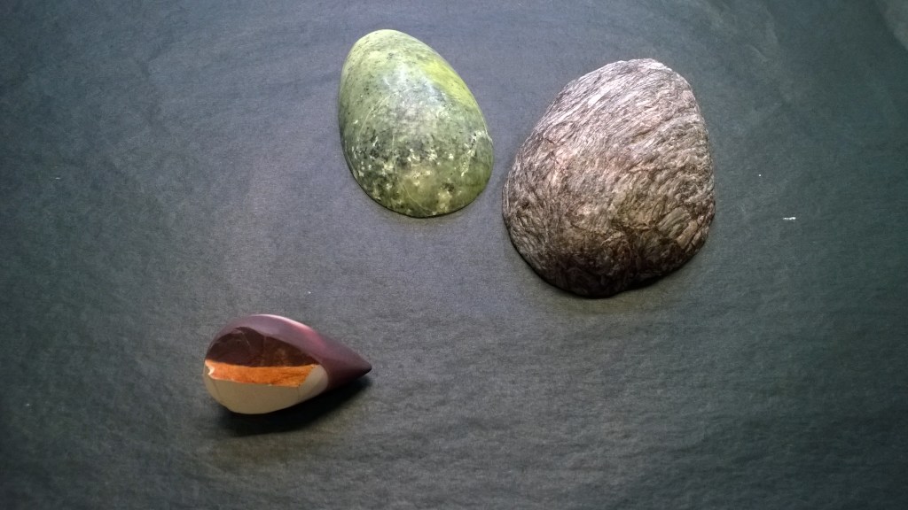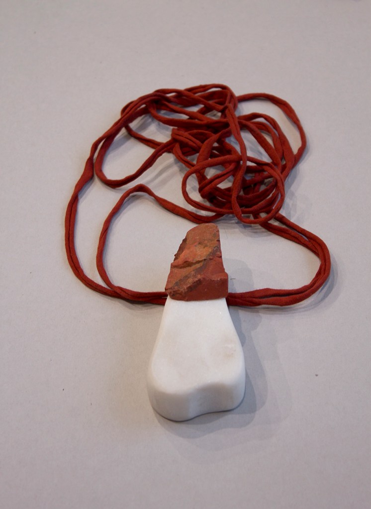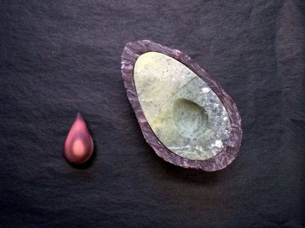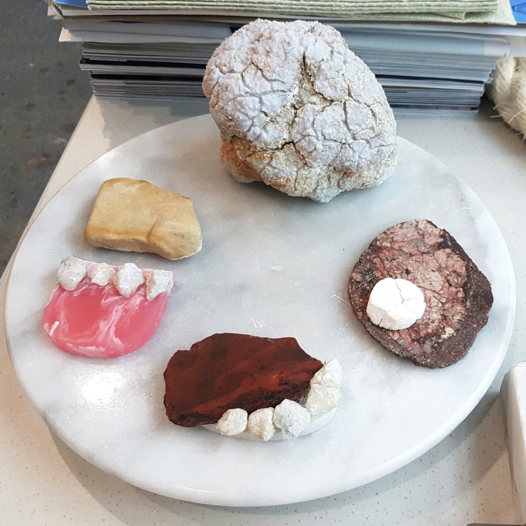 Delicacy. 2016. Serpentine, jasper printstone and found stone.Breakfast for Two. 2016. Cacholong, orange calcite, jasper printstone and slate.Delicacy II. 2016. Cacholong and orange calcite.Tragedy. 2016. Pink opal and birch.Organs I – X. 2017. Marble, jasper, angelite, found stones and Colorado rose red granite.
