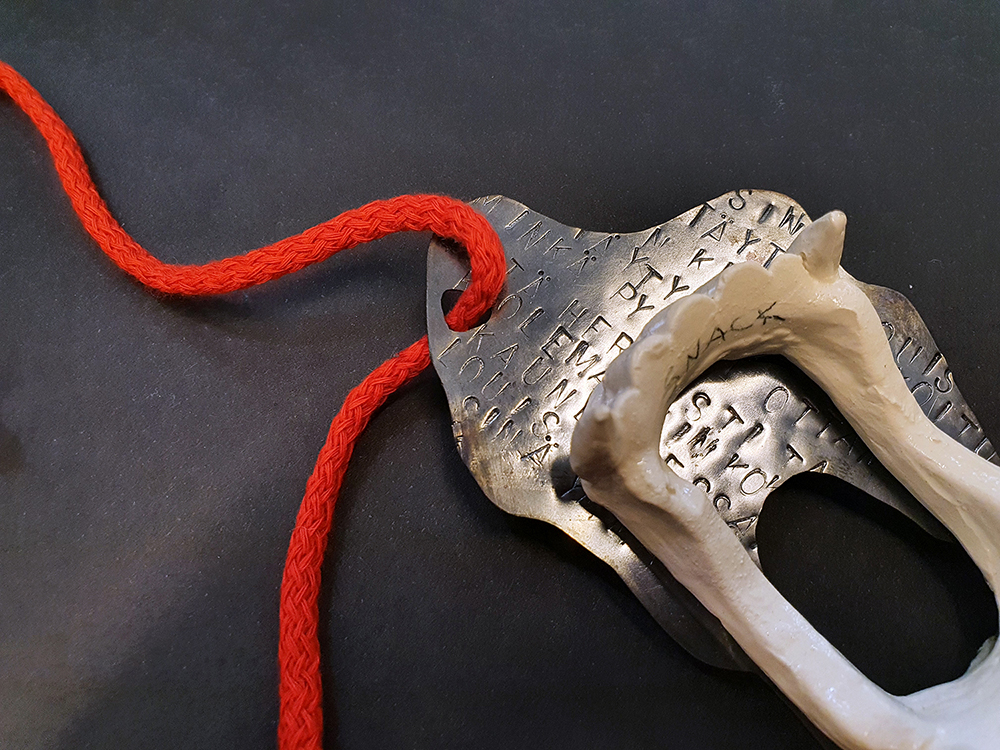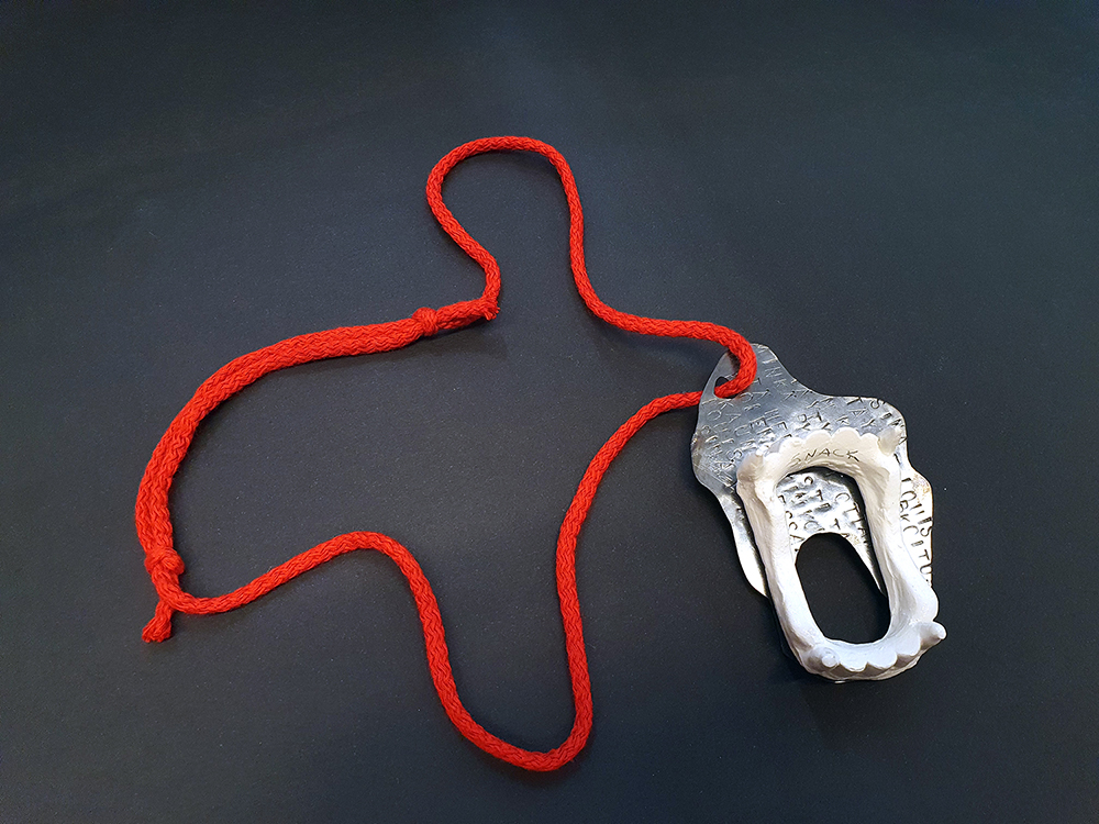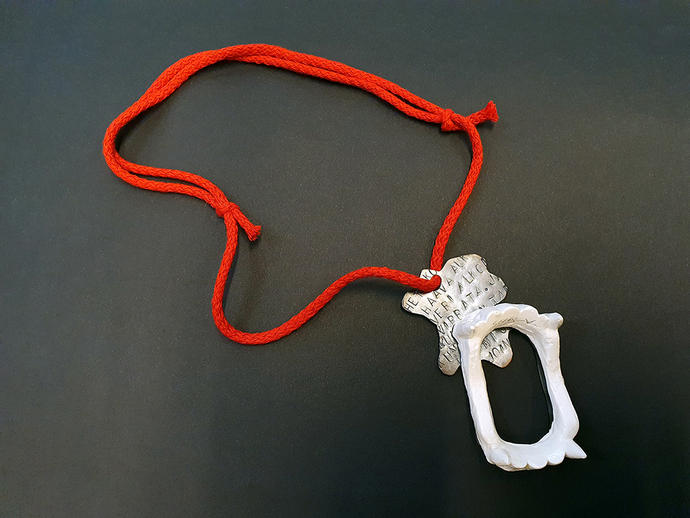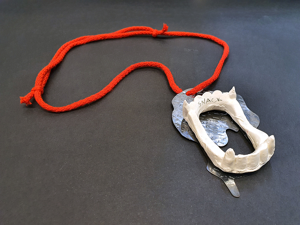 I represent SNACK. The cheapest fake fangs turned eternal with slip clay, attached to a puddle of copper blood echoing the words from Anne Rice vampire novels. Scenarios of drinking blood, coppery taste on your tongue. The patina will rub off eventually, like it did from the edgiest gothic jewellery one could buy with a little pocket money. The string is red, as blood running down your neck and collarbones. Wear it proud, with a confidence of a teen ,who couldn’t care less what anyone else thinks.